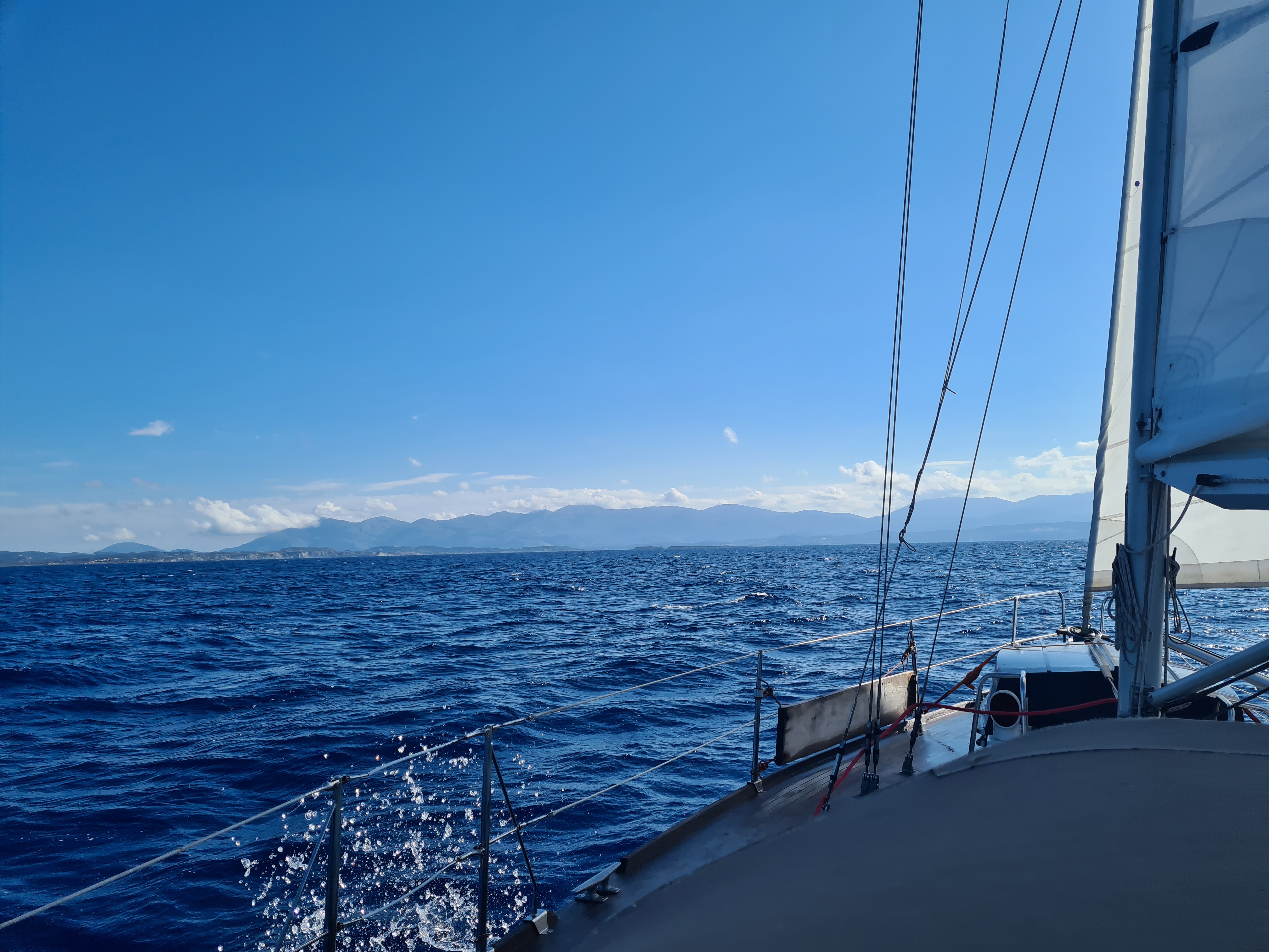 We vertrekken met voorspellingen voor een rustige eerst dag en meer wind voor de tweede. Gedurende de eerste dag zeilen we de ochtend maar in de middag valt de wind weg en gaat de motor aan. We varen over een eindeloos blauwe, vlakke zee en zien weinig andere boten. Tegen de avond douchen we in de kuip, maken voor 2 dagen eten en brood en dan trekt de wind toch weer aan: we kunnen weer zeilen en houden dat gedurende een groot deel van de nacht vol. Tegen de ochtend gaat de motor weer een paar uur aan. We zien een zeeschildpad die ook op weg is naar Griekenland. 2 x landt er een uitgeputte vogel aan boord, maar lang blijven die niet. Verder alleen blauw en blauw, water en lucht. Op ons scherm zien we soms een boot op gepaste afstand, we zijn toch niet helemaal alleen. In de loop van de ochtend van de 2e dag trekt de wind dan definitief aan, uit noord, we hebben halve wind. Fijn omdat we daarmee goed vooruit komen, maar minder fijn dat zodra die boven de 20 knopen uitkomt ook de golven hoger worden en dwars tegen Luna aan bonken. Gelukkig houdt Poseidon zich aan de voorspelling en blaast ons gestaag met mooie snelheid naar Kefalonia. 48 uur na vertrek zien we land, hoewel we nog een paar uur te gaan hebben voelt het als of we er al zijn. 5 mijl voor aankomst valt de wind weg, langzaam tuffen we de laatste mijlen op de motor de diepe baai van Argostoli in. Na 275 mijlen en 52 uur laten we het anker zakken in de baai voor het dorp en begroeten de eerste zeeschildpadden. Tot onze verrassing en vreugde worden we verwelkomt door Mayte en Niels van de Muskat, zij waren een dag eerder vertrokken met bestemming Pylos maar werden door de wind naar Kefalonia gebracht. We slapen een lange siësta, eten en drinken en slapen 12 uur onze eerste Griekse nacht door. We zijn er, de vakantie kan beginnen!