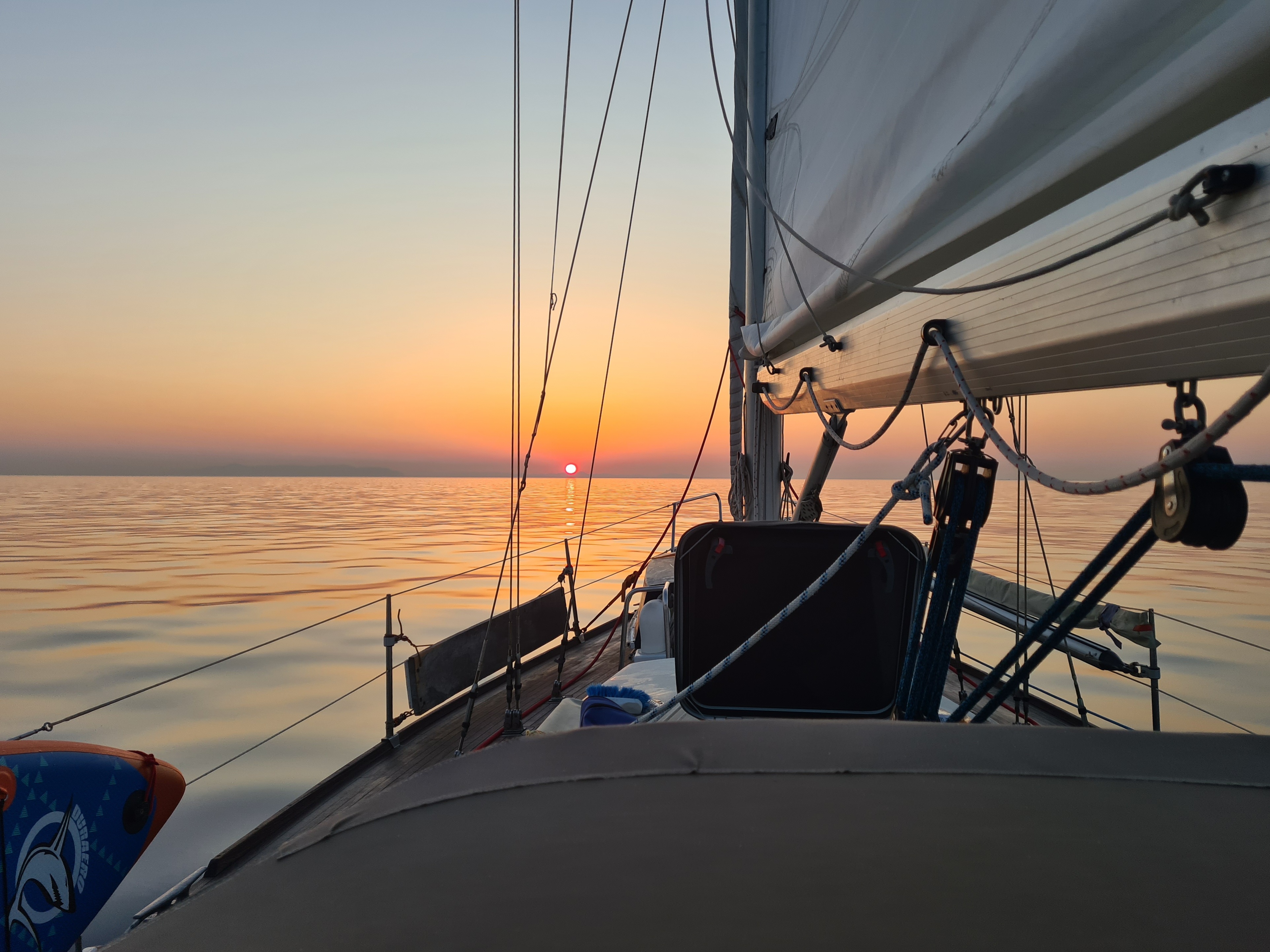 Pijn doet het wel, we kunnen behalve de laatste 2 uur niet zeilen en voelen ons spelbrekers door de motor zoveel uren te draaien. Het blijft een lastig dilemma, motor aan of niet… we zijn natuurlijk onderweg met een zeilboot om te zeilen en nemen dat best serieus. Ook al gaan we langzaam vooruit proberen we het aanzetten van onze motor zo lang mogelijk uit te stellen. Voorwaarde is wel dat we ergens aankomen in veilige omstandigheden, bijvoorbeeld voor slecht weer of voor het donker in lastige ankerplaatsen of havens. In de loop van de zomer vertrekken we meermalen in de avond, een nacht op zee zonder haast en met goede wind geeft voor een tocht van meer dan 50 mijl rust, we komen dan altijd bij daglicht aan en in de nacht blaast de Meltemi minder hard dan overdag. Dat we dan een nacht weinig slapen nemen we tegenwoordig op de koop toe, we hoeven niet naar ons werk en kunnen de dagen erna genoeg tijd vinden om bij te slapen!