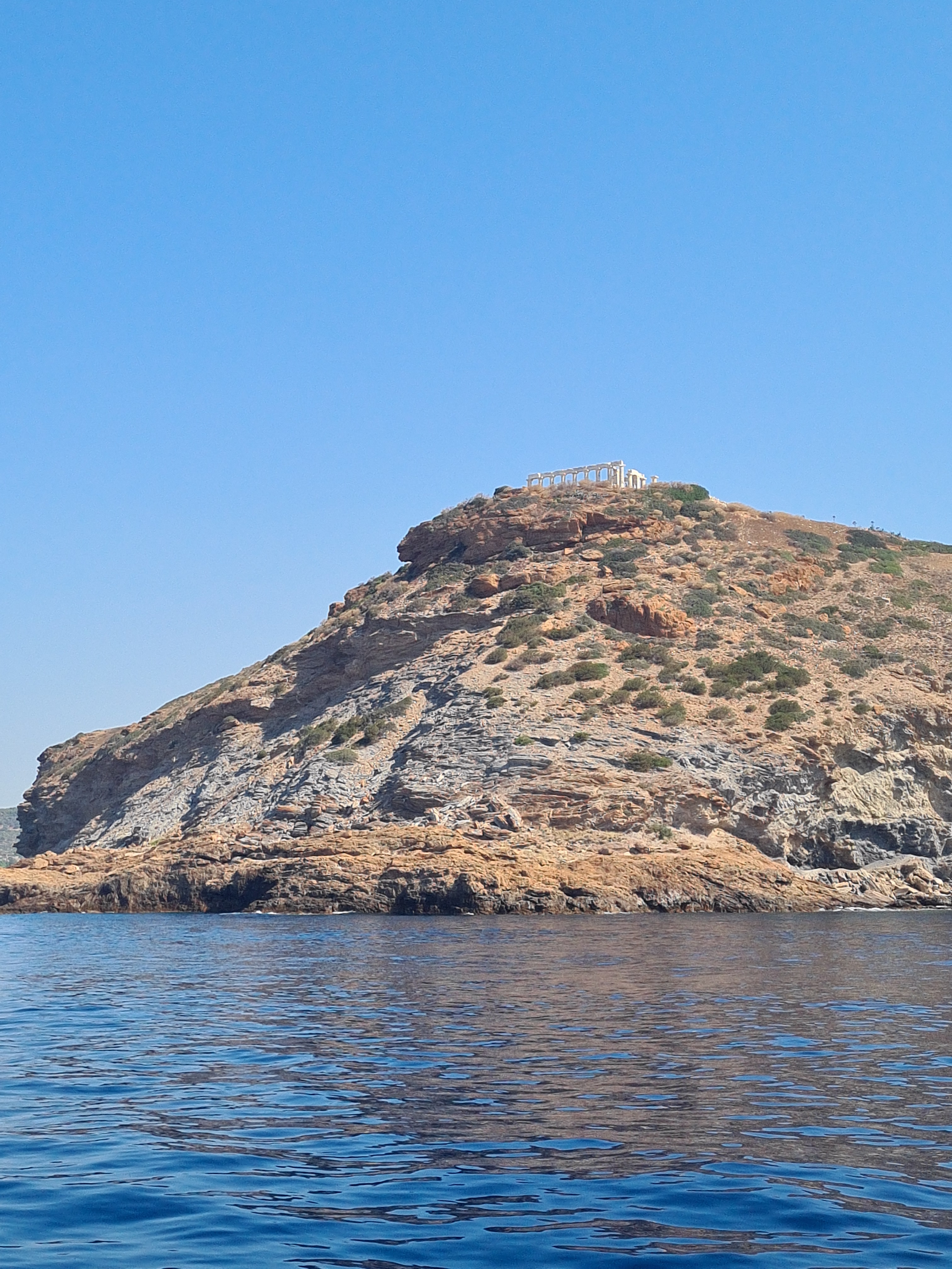 Vanaf Kaap Sounion, met de indrukwekkende tempel van Poseidon er op, varen we de Golf van Evia in (Evvoiekos Kolpos) tussen het vaste land en het eiland Evia (of Evvoia of Euboea). Het eiland, en de zeestraat er onder, is zo’n 180 kilometer lang en het is er prachtig!