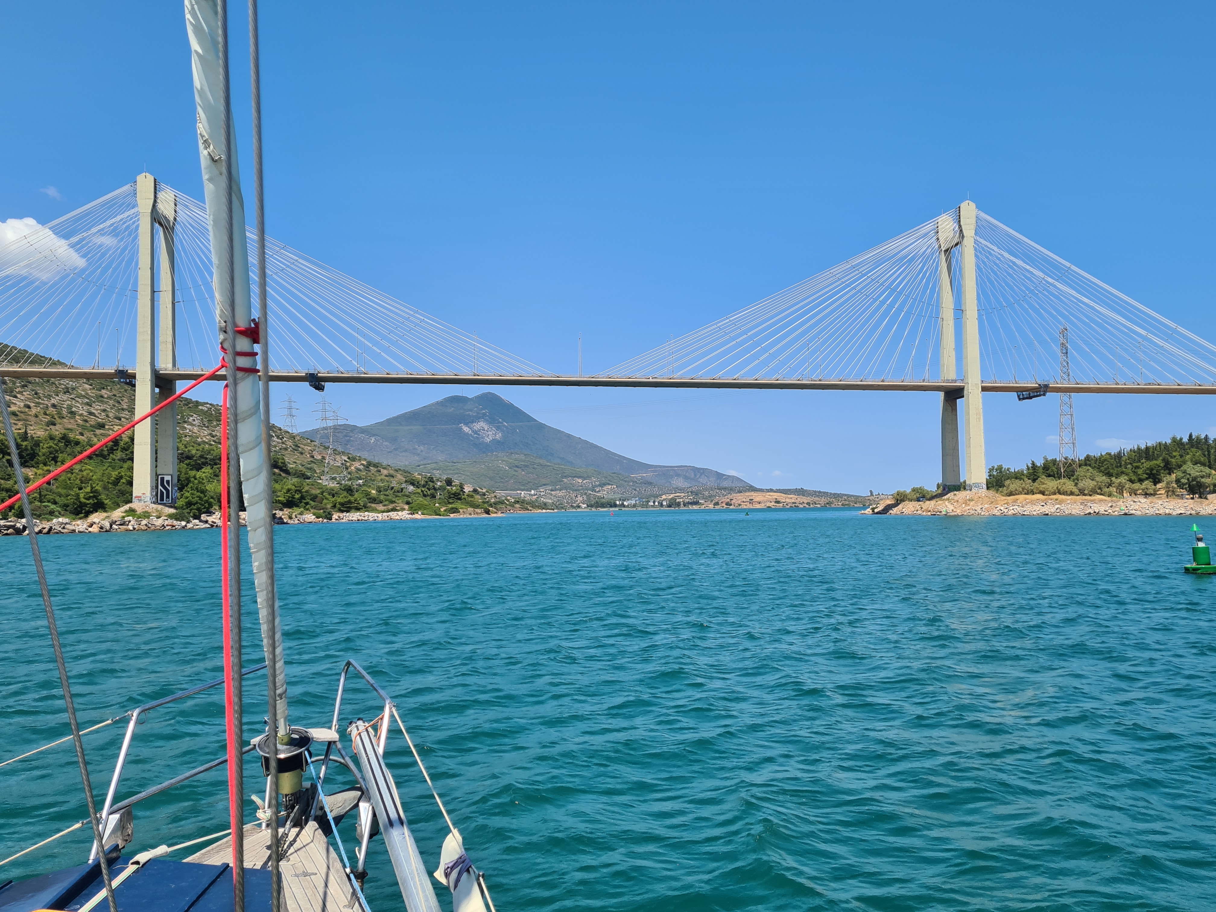Om een doorvaart te krijgen moeten we ons aanmelden bij de Port Authorities. Na het invullen van een uitgebreid document met alle scheepspapieren (verzekering!) en betaling van 37 euro worden we op de lijst geplaatst voor de doorvaart maandagnacht. We krijgen instructies om vanaf 21.30 uur de marifoon op kanaal 12 standby te hebben en zodra we worden opgeroepen moeten we ons klaarmaken voor de doorvaart die dan binnen 20 minuten zal plaatsvinden. Luna bevind zich op de ankerplaats net zuidelijkwestelijk van de brug tezamen met nog zeker 15 andere zeilboten waarvan we vermoeden dat de meeste met ons mee zullen varen. Om 21.30 zetten we de marifoon aan, na een uurtje beginnen de eerste zenuwachtige schippers al oproepen uit te zenden hoe lang het nog gaat duren, en om 2.30 beginnen dan eindelijk de oproepen voor de brugpassage en klinkt ook het verlossende bericht: Luna, make ready for passing!! We halen het anker in het pikkedonker op en varen voorzichtig naar de brug, daar is het opnieuw wachten tot we aan de beurt zijn, de lijst wordt eerst nog één voor één afgewerkt maar omdat dat blijkbaar te lang duurt roepen ze de rest op om met gepaste afstand van elkaar de brug te passeren. In een keurige rij en met flinke snelheid, de laatste stroom vanuit zuid is nog altijd fors, spoelen we om 3.00 ’s morgens de gekke wateren van Chalkis door. Iets voorbij de brug is een kade waar we kunnen aanleggen. Daar waren we met vooruitziende blik een dag ervoor al naartoe gelopen om te kijken of het daar veilig afmeren was. Gelukkig is het niet aardedonker, de vele straatlantarens zetten de kade in voldoende licht om veilig te kunnen afmeren. We slapen nog een paar uur, kijken nog één keer om naar de indrukwekkende stroming onder de brug en zetten onze tocht onder Evia voort, zoals altijd tegen de wind, opkruizend en blij dat we hier geweest zijn!