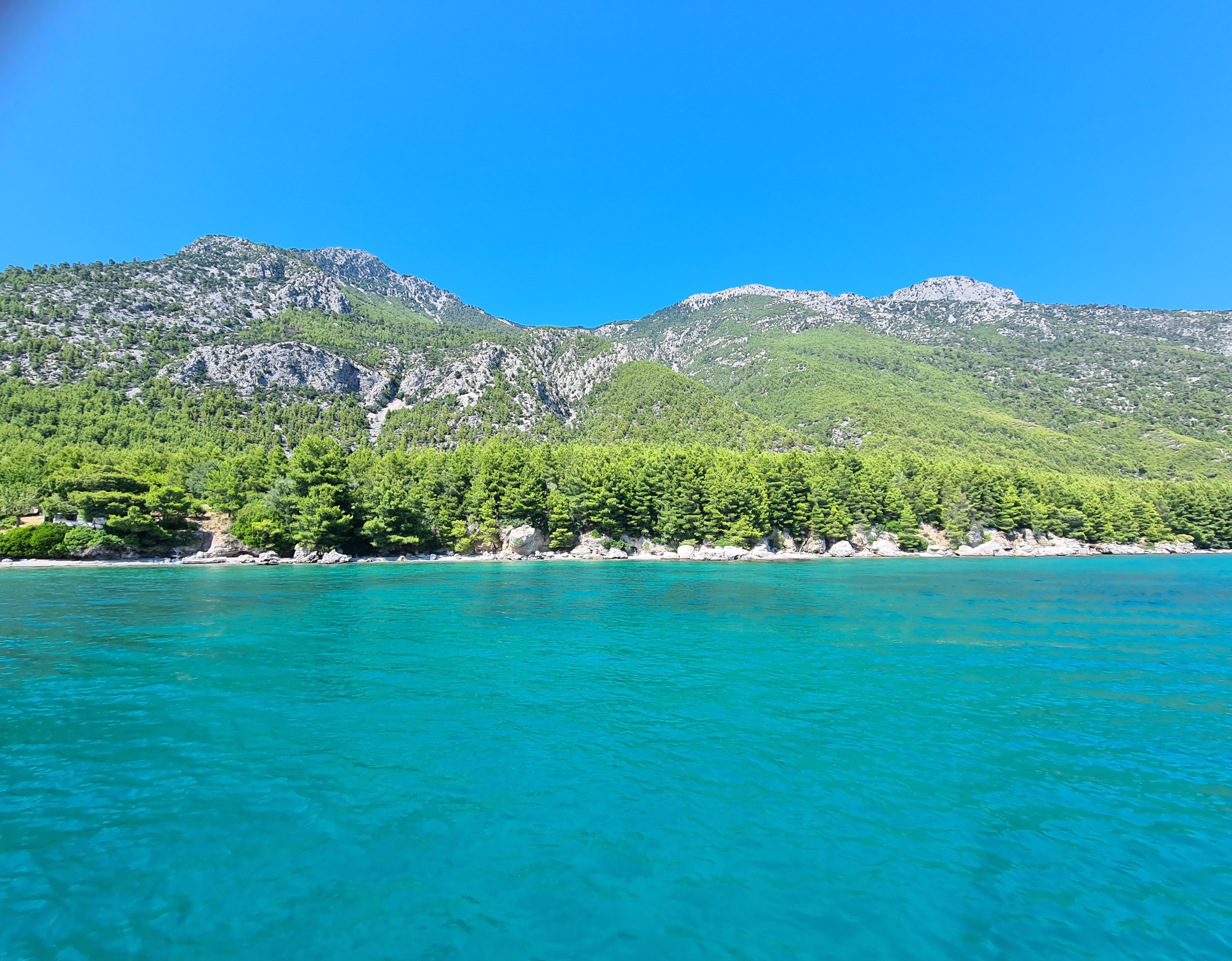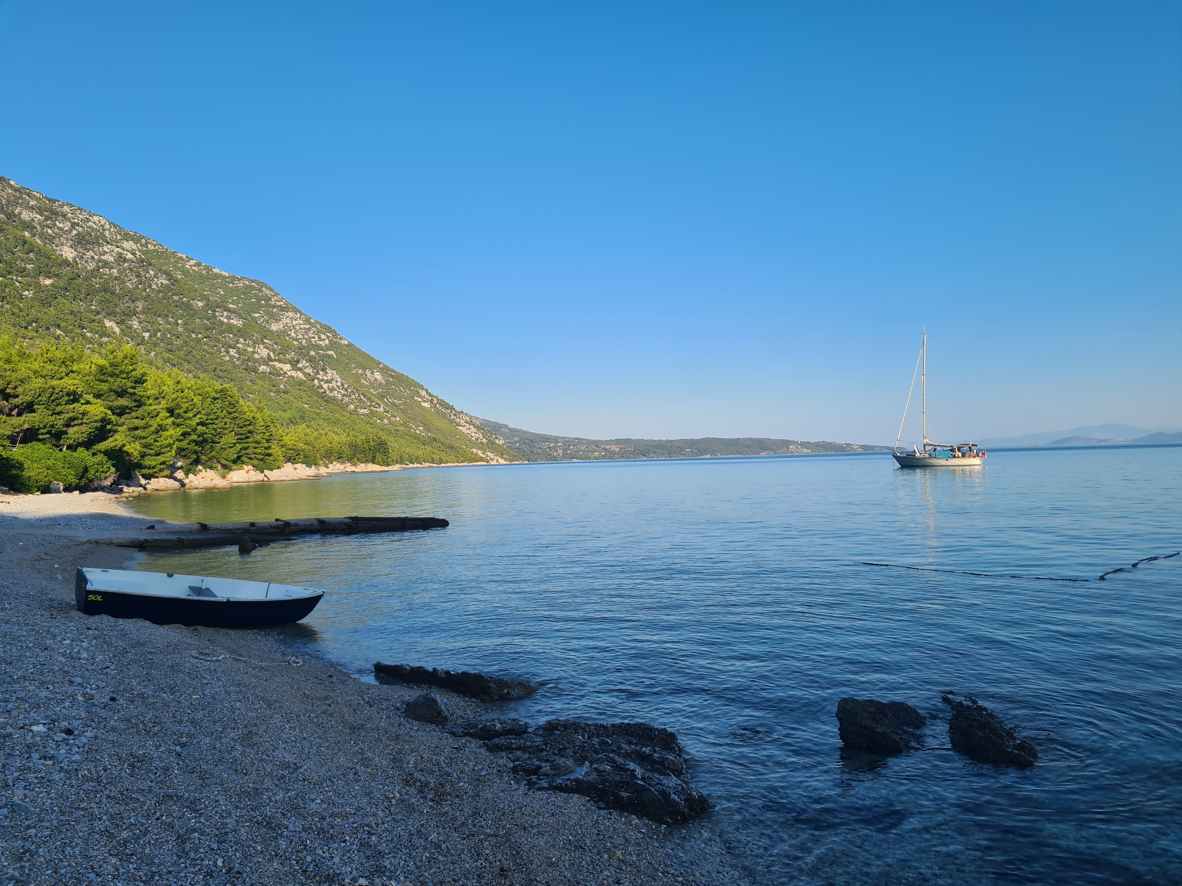 Hoge bergen met oneindige pijnboombossen naast prachtig diepblauw tot turquoise water, verlaten eilandjes, af en toe een dorp of stadje, weinig scheepvaart en mooie ankerplekken maken het een prima tocht. De wind komt onder invloed van de Meltemi meestal uit noord en om onze reis wat langer te laten duren perst de wind zich tussen de berghellingen aan weerszijden door en hebben we deze vrijwel continue recht van voren. Opkruizen dus, en als we het zat zijn stoppen we in één van de vele ankerbaaien voor een frisse duik, rustige namiddag en een mooie zonsondergang. We hebben geen haast en de volgende dag hijsen we de zeilen voor de volgende mijlen richting de noordwest punt van Evia.