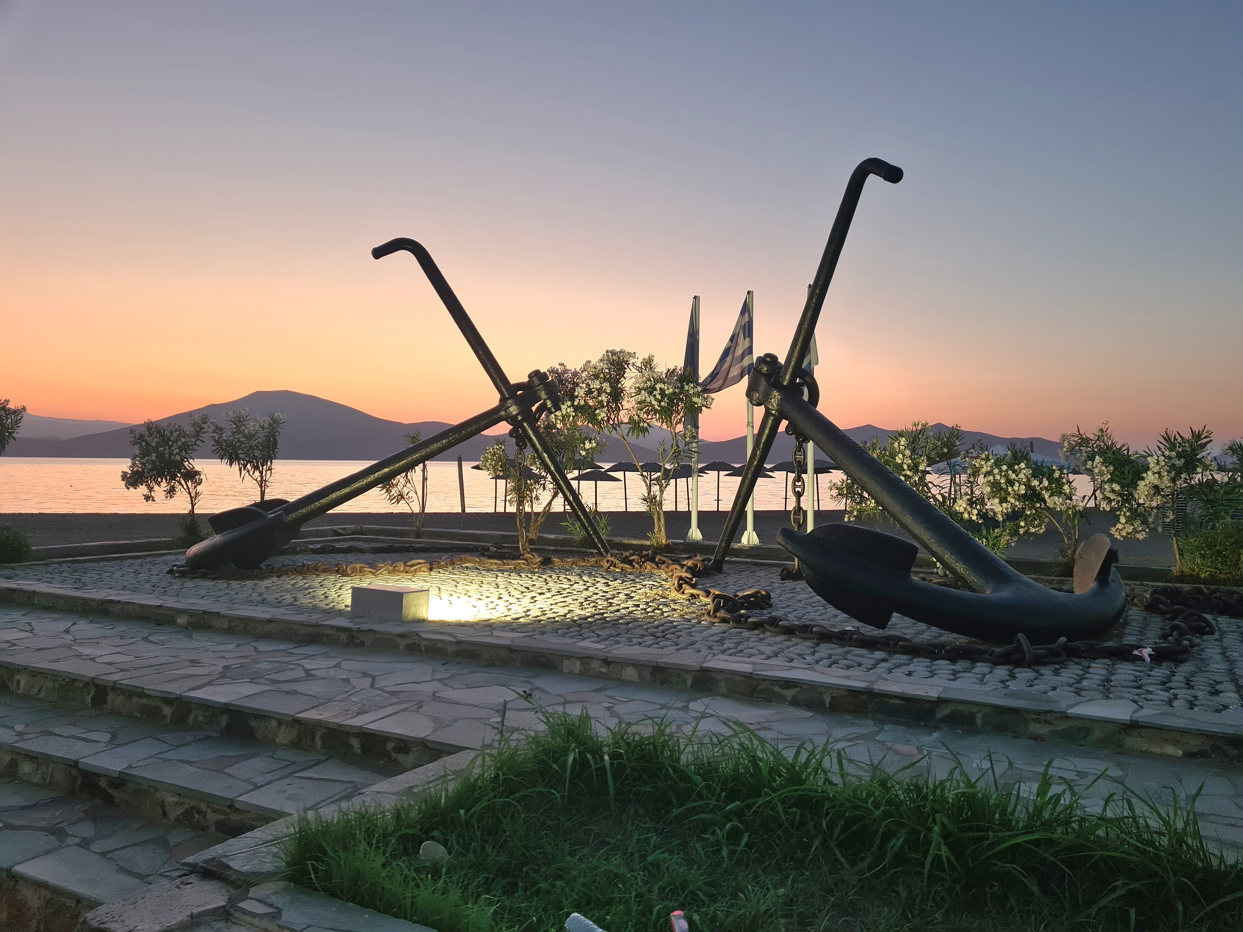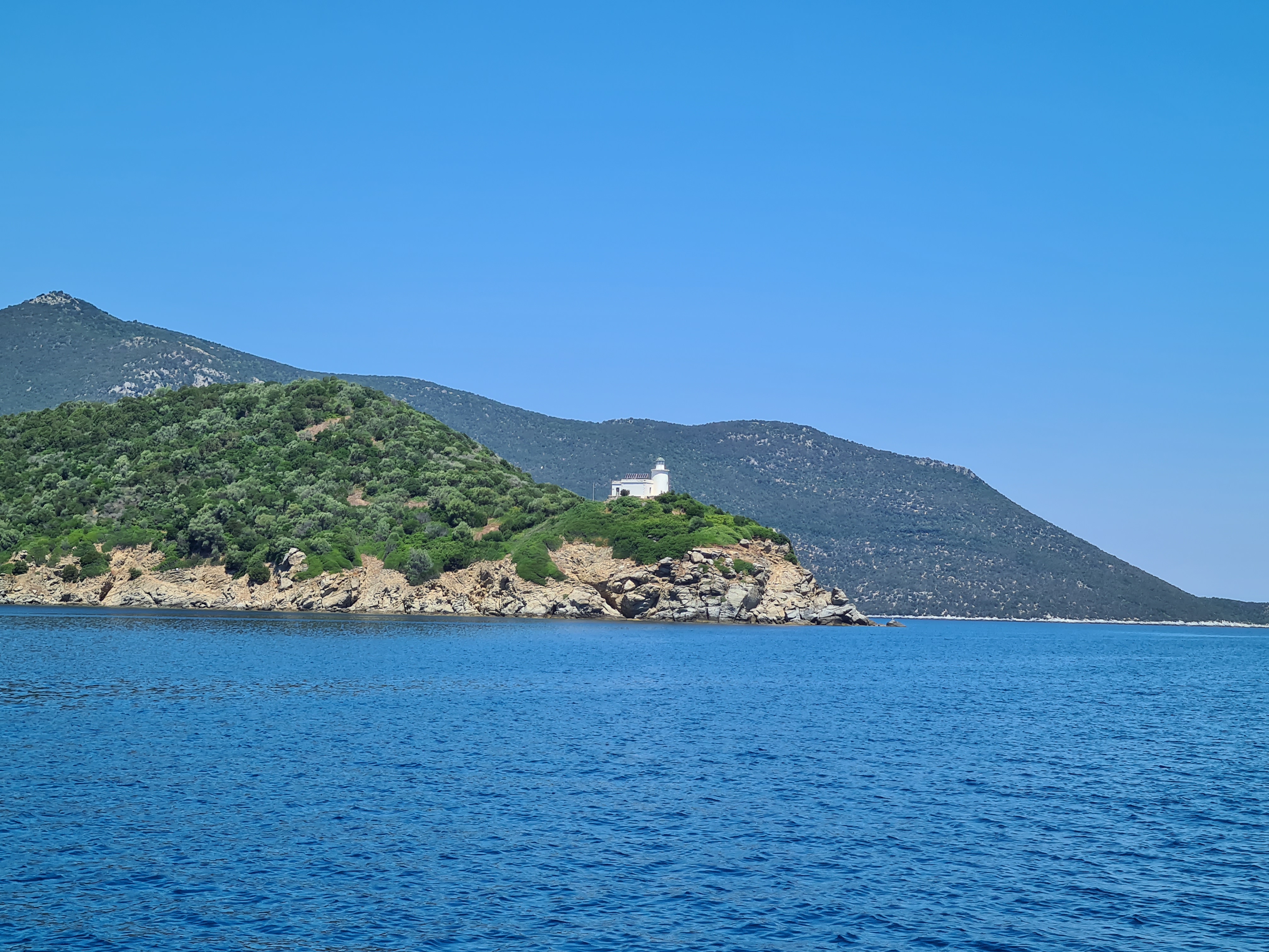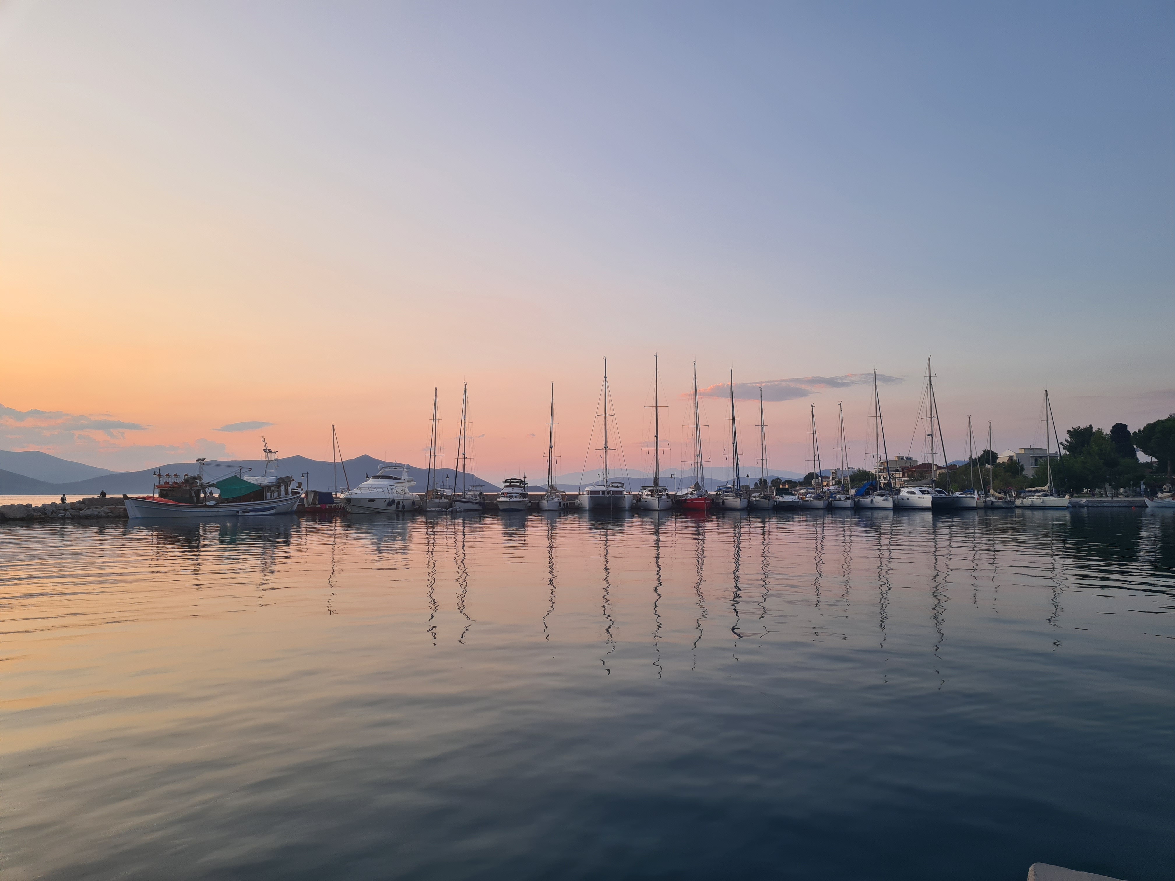 Na 3 zeildagen bereiken we Port Orei, aan de noordkant van Evia. Hier leggen we Luna aan de stadskade en genieten een week lang van het leven aan de kade. De setting is prachtig, direct achter de kade waar we aan vast liggen is een mooi zandstrand waar we een paar keer per dag een duik nemen, op het strand staan douches waar we ons ongelimiteerd kunnen afspoelen. Het rustige en wat slaperige stadje heeft een leuke boulevard met zeer betaalbare tavernes, een bakker, wasserij, supermarkt, viswinkel en slager. Als het na een week weer begint te kriebelen, zeilen we verder naar de Noordelijke Sporaden en kort daarna naar Chalkidiki. In de komende blogs zullen we over deze gebieden zeker meer schrijven. We hebben besloten de zomer door te brengen in dit gebied en behalve ons uitstapje naar Lemnos zal de attente lezers en volger onze boot hier zien rondtoeren. De Meltemi bepaalt waar ons anker kunnen laten zakken, welke route we varen en bij temperaturen van > 30 C houden wij ons gedeisd. Behalve het hoofd en de voeten koel houden en zo ontspannen mogelijk de dag doorkomen hebben we even geen doel meer.