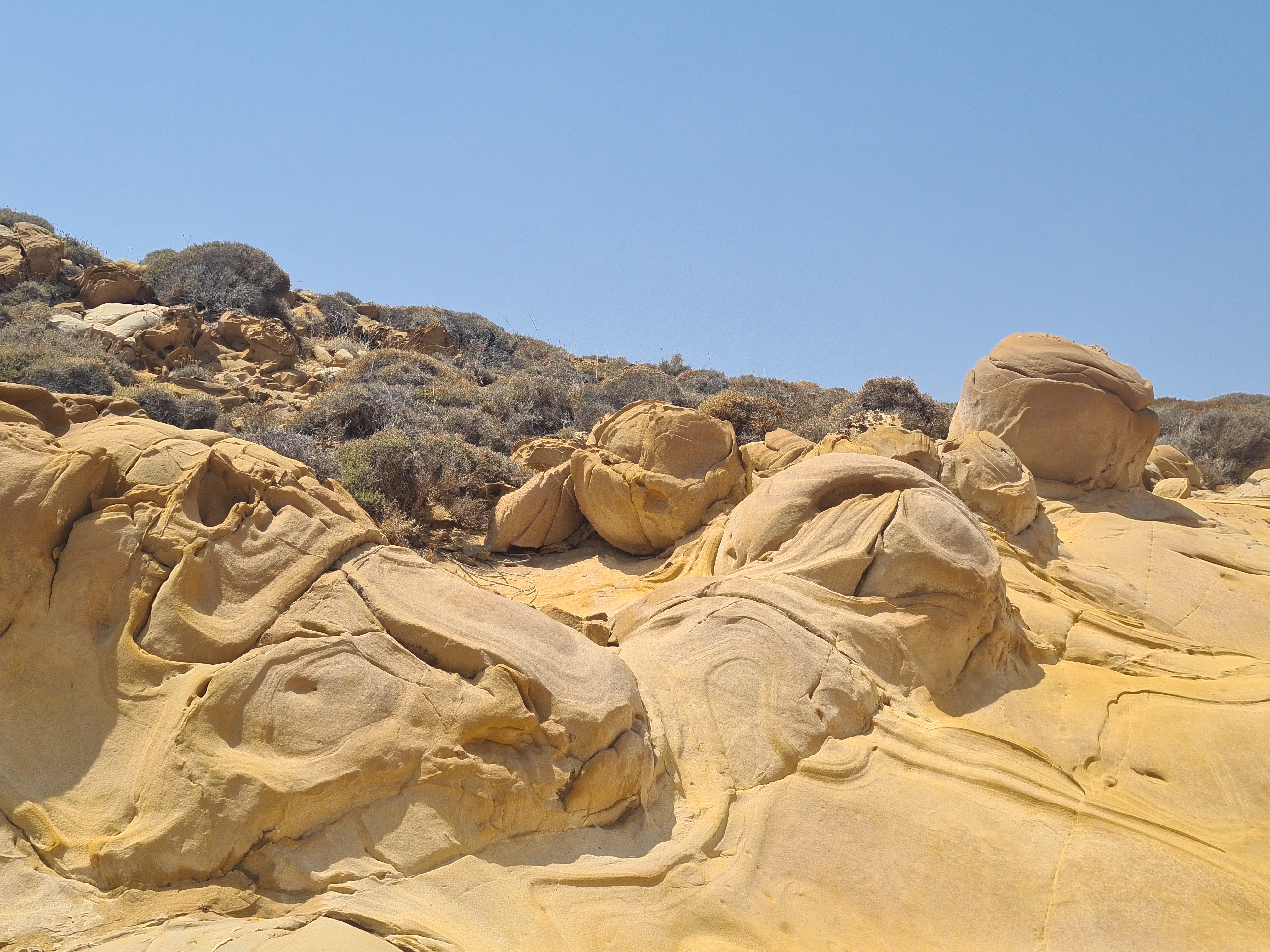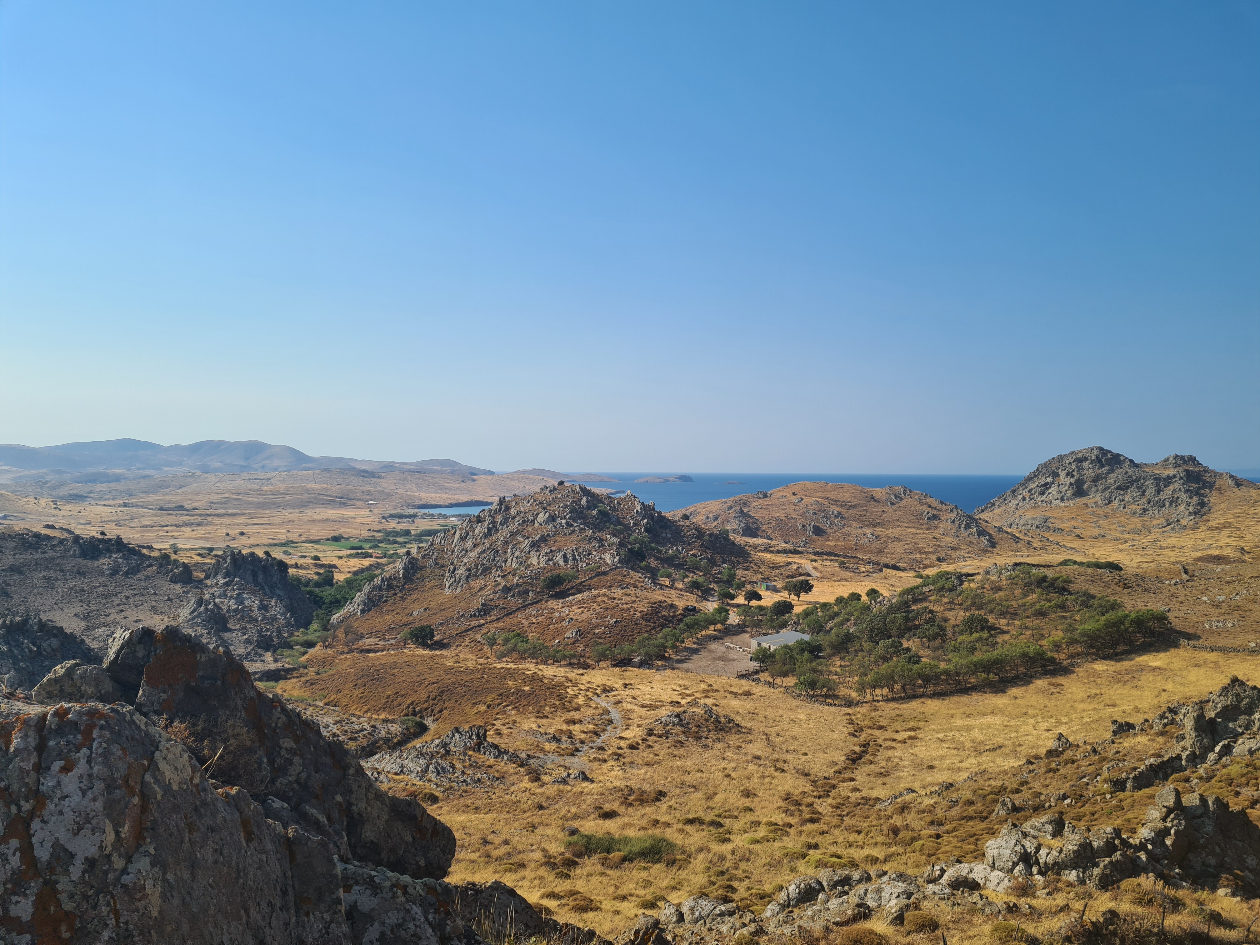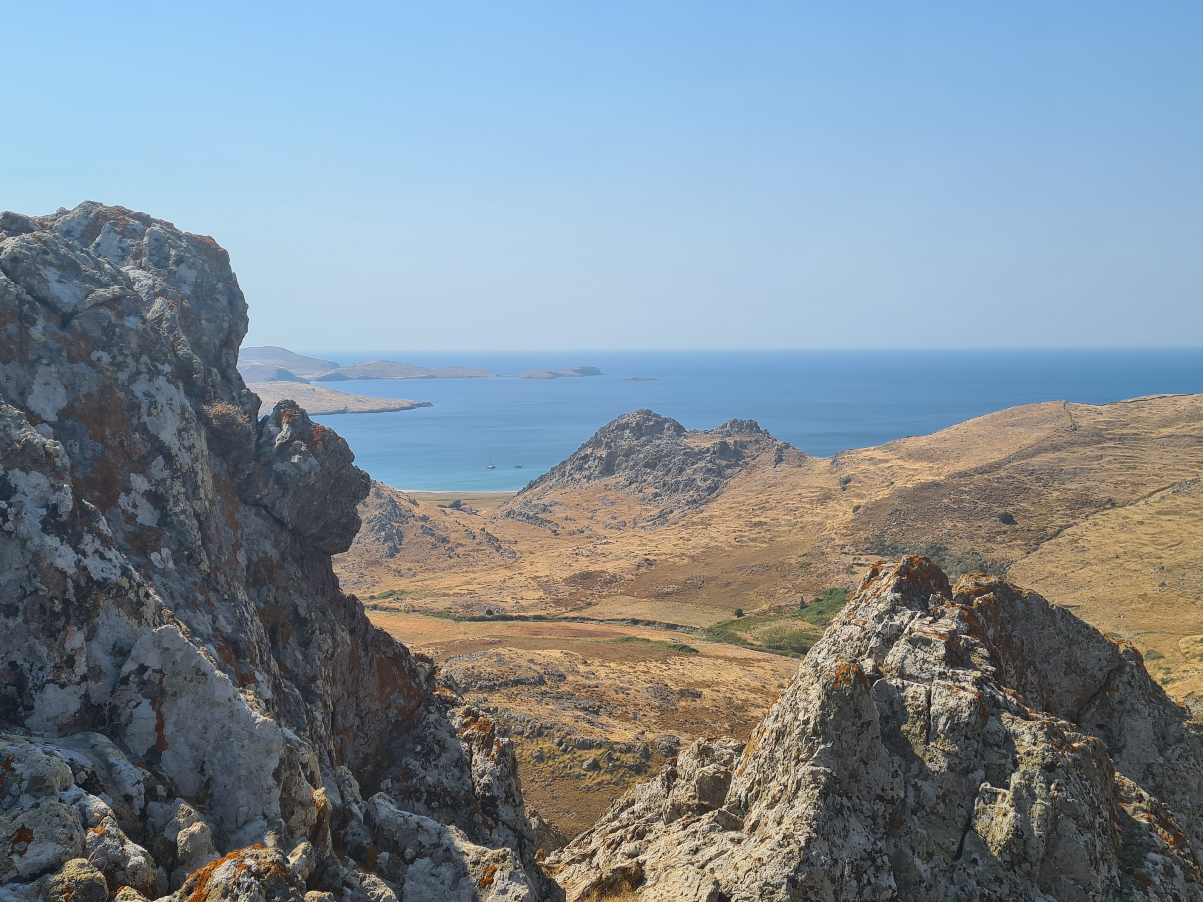 ‘Ongelooflijk hé, het is 19 juli, topdrukte in Griekenland en we liggen hier alleen in een verlaten baai op een prachtig eiland’ jubelt Mayte. ‘We zijn blij als we af en toe in de verte hier een boot voorbij zien zeilen, maar het is heerlijk ver weg te zijn van alle drukte’. We zijn inderdaad op zijn minst verwonderd over de ‘verdeling’ van de drukte op de Egeïsche Zee. Hier op Lemnos is het in de meeste baaien ‘deserted’, vrij vertaald: eenzaam, verlaten, ruig, droog en zandkleurig. Het eiland kenmerkt zich door kale rotsen, zandvlaktes, oude lavasteen en de afwezigheid van bossen. Alleen rond de kustplaatsen Myrina en Moudros zijn wat begroeide zones, schaduwrijke boulevards en wat toerisme.