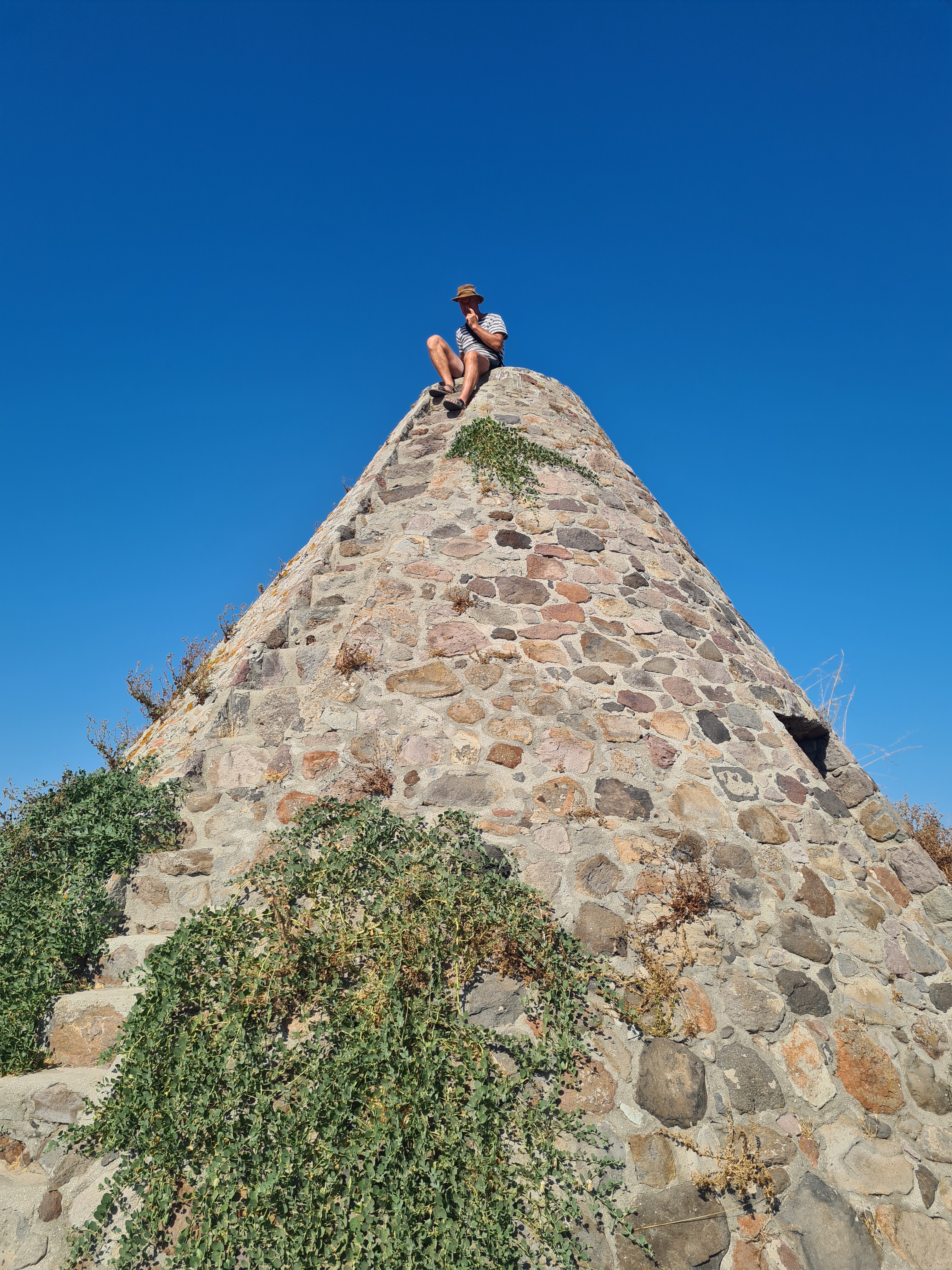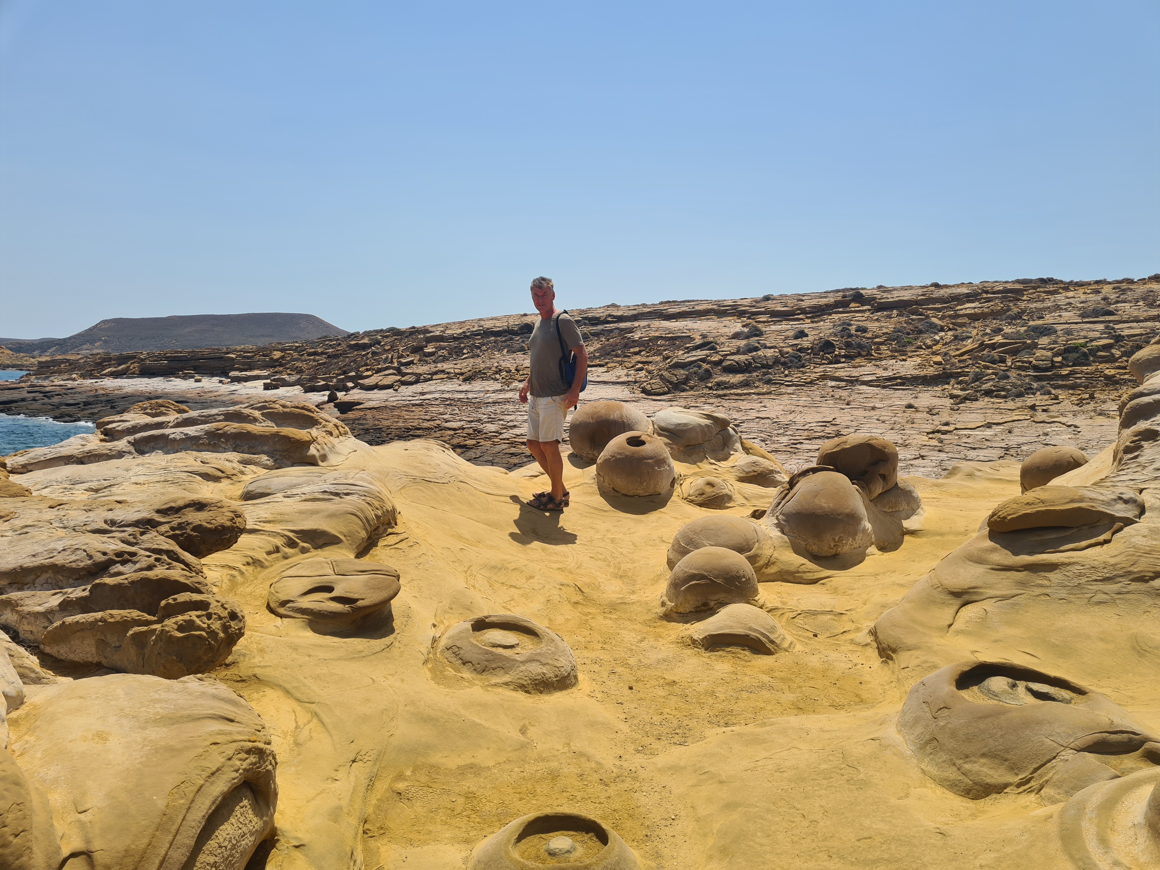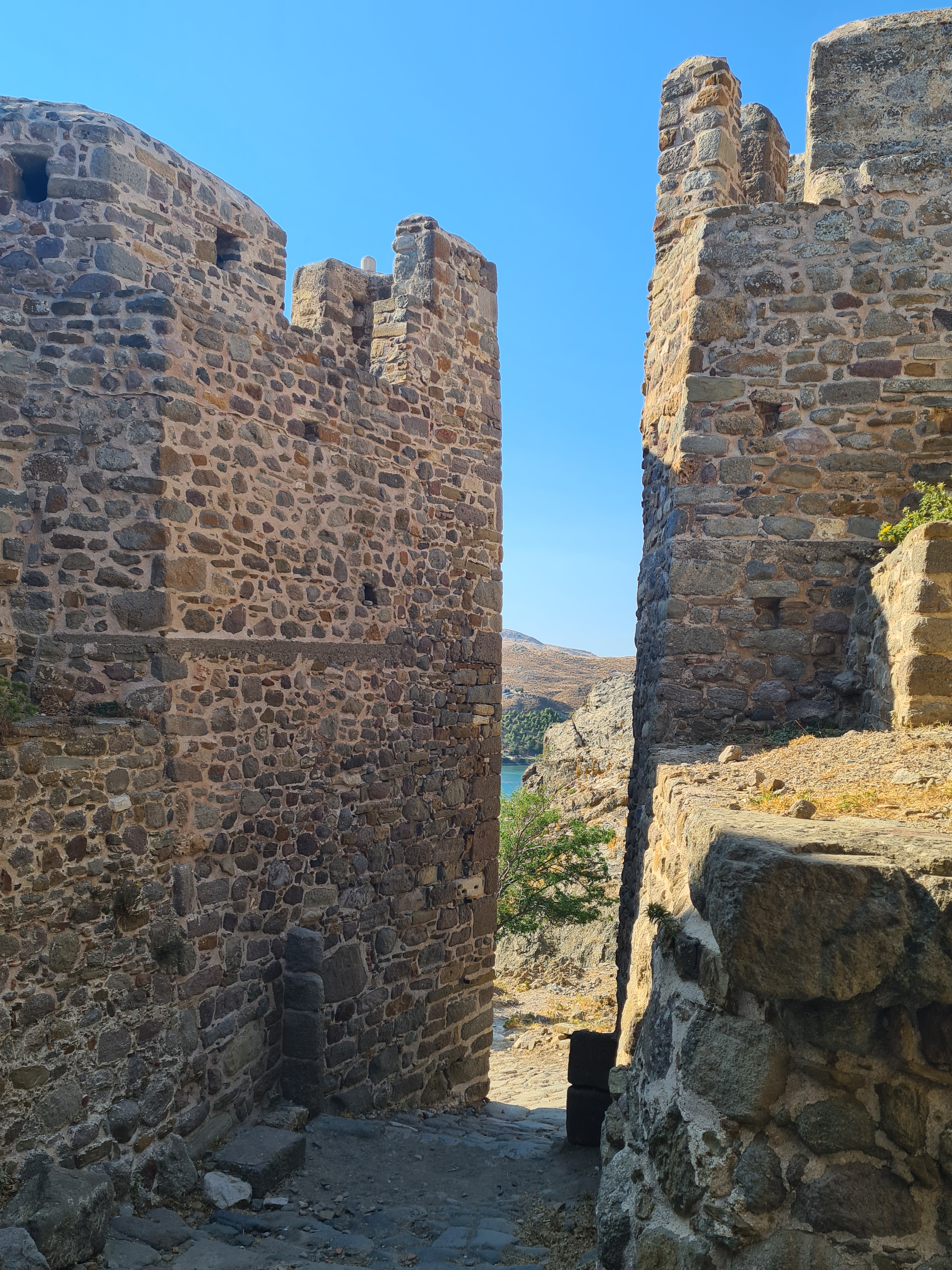 ‘Ongelooflijk hé, het is 19 juli, topdrukte in Griekenland en we liggen hier alleen in een verlaten baai op een prachtig eiland’ jubelt Mayte. ‘We zijn blij als we af en toe in de verte hier een boot voorbij zien zeilen, maar het is heerlijk ver weg te zijn van alle drukte’. We zijn inderdaad op zijn minst verwonderd over de ‘verdeling’ van de drukte op de Egeïsche Zee. Hier op Lemnos is het in de meeste baaien ‘deserted’, vrij vertaald: eenzaam, verlaten, ruig, droog en zandkleurig. Het eiland kenmerkt zich door kale rotsen, zandvlaktes, oude lavasteen en de afwezigheid van bossen. Alleen rond de kustplaatsen Myrina en Moudros zijn wat begroeide zones, schaduwrijke boulevards en wat toerisme.