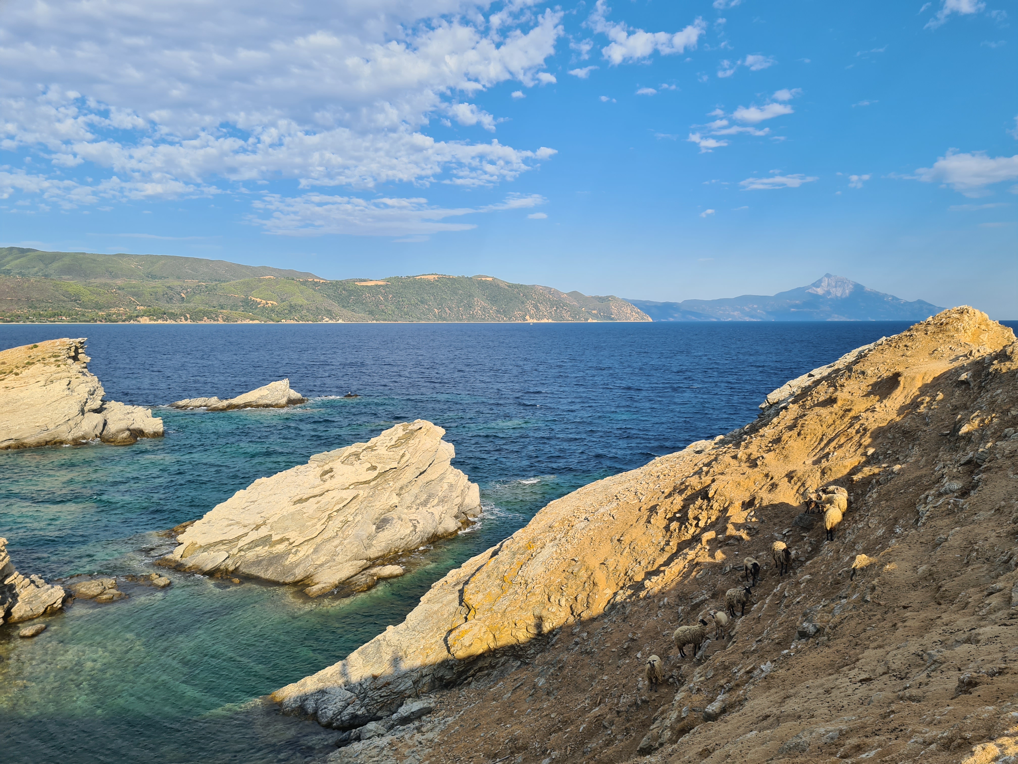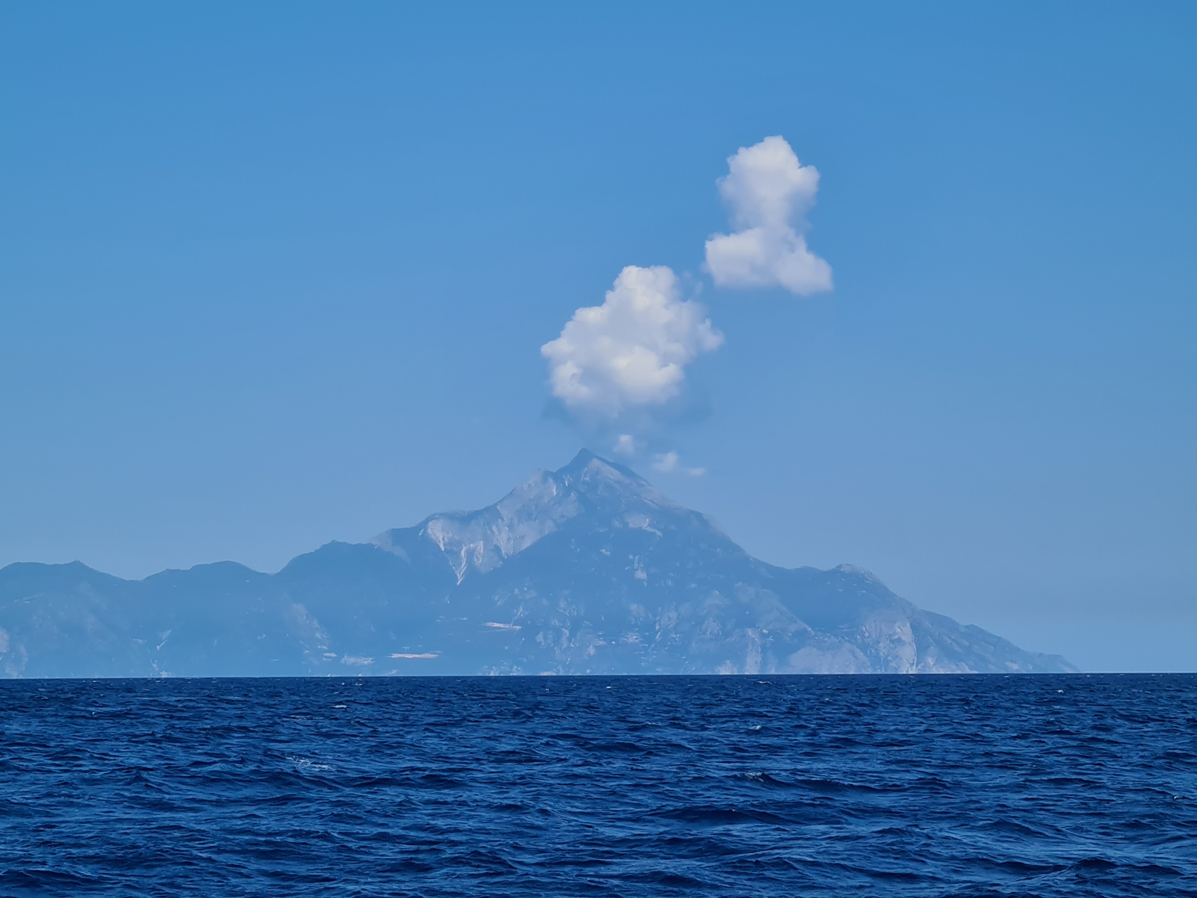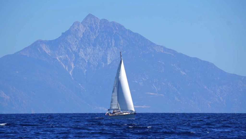 Niet veel later begint het ochtendgloren zonder dat ik verder iets of iemand heb kunnen waarnemen in de donkere nacht, geen boot, geen vissen, geen zeezoogdieren. Bij de zonsopkomst verschijnt als eerste de berg Athos aan de horizon, de indrukwekkende berg van 2000 meter hoog op het smalle, noordelijke schiereiland van Chalkidiki. De regio Chalkidiki in de Griekse provincie Macedonië bestaat uit 3 schiereilanden: Cassandra, de zuidelijkste, en laagste met de lange, lege zandstranden. Sithonia, de middelste, met de met pijnbomen begroeide bergen en vele baaien. En noordelijk Athos, gedomineerd door de hoge berg met dezelfde naam én een bijzonder verhaal.