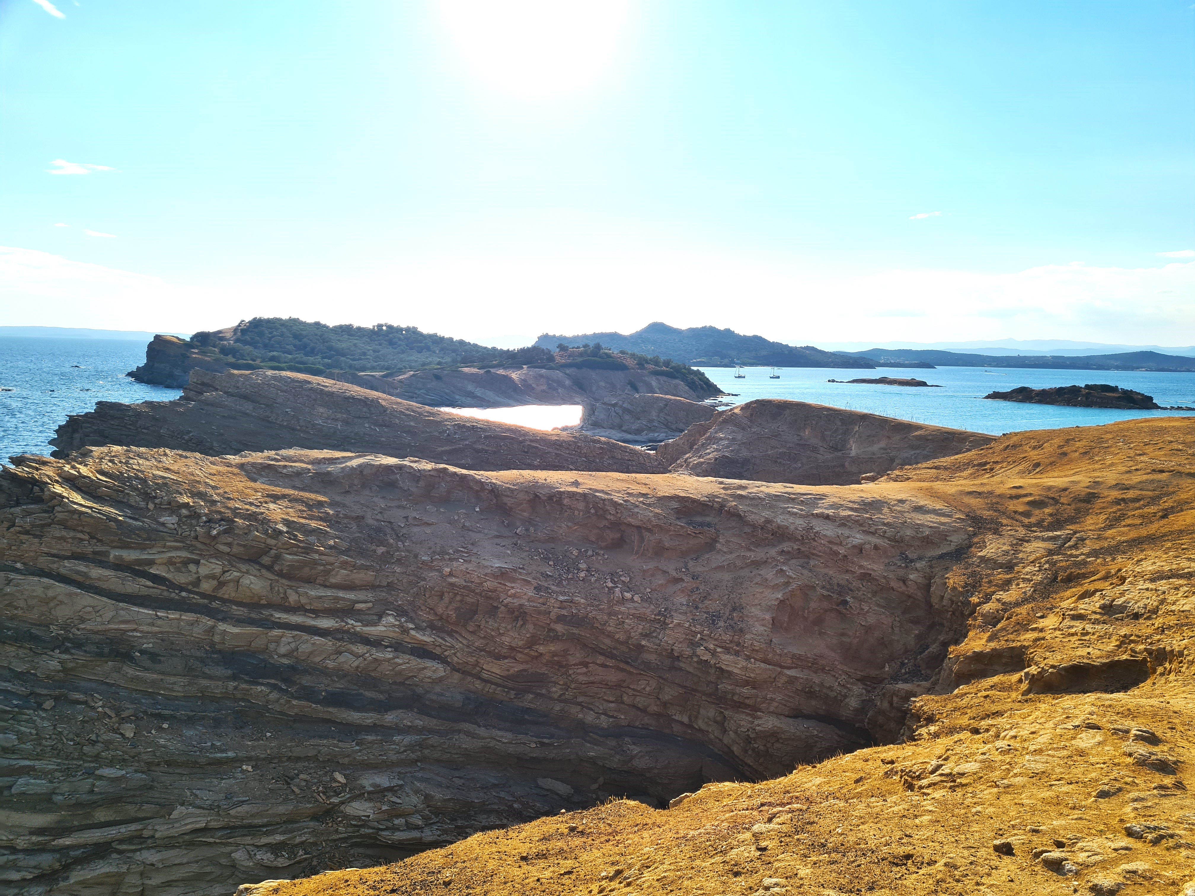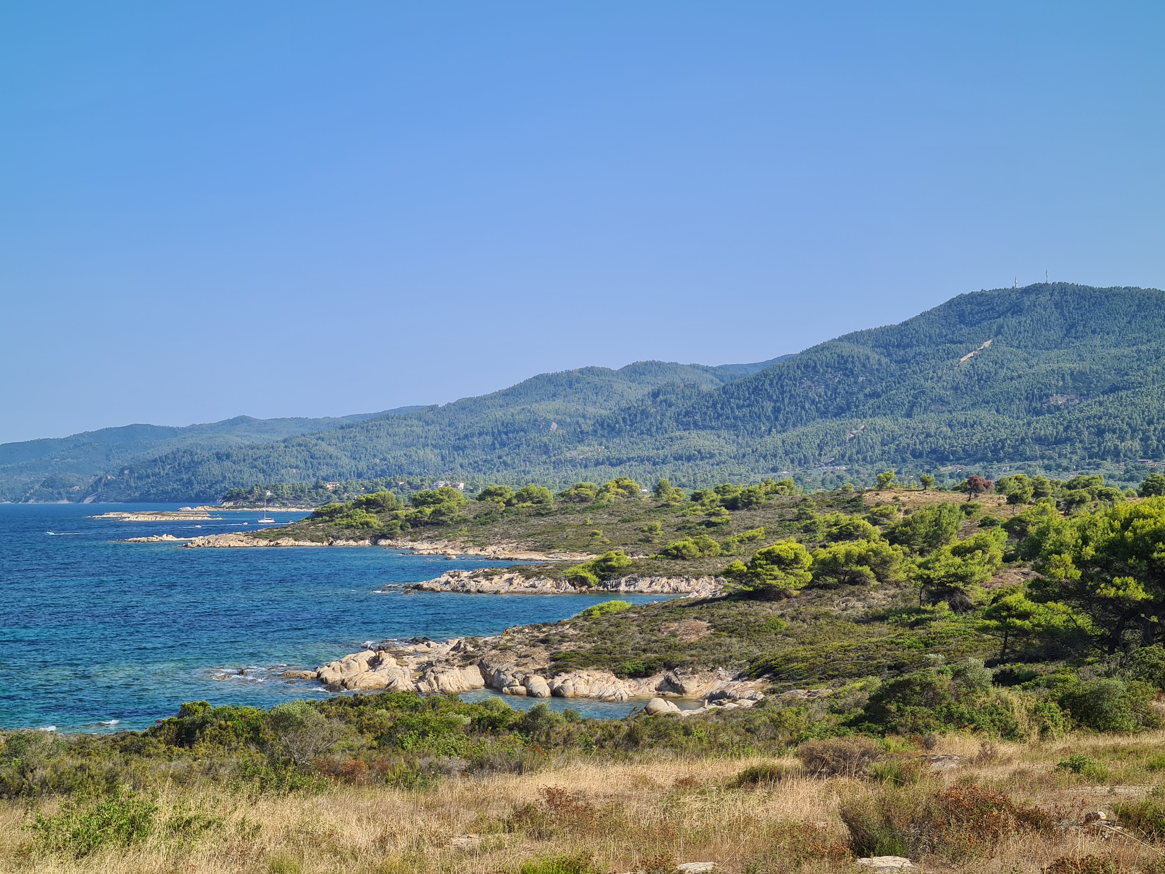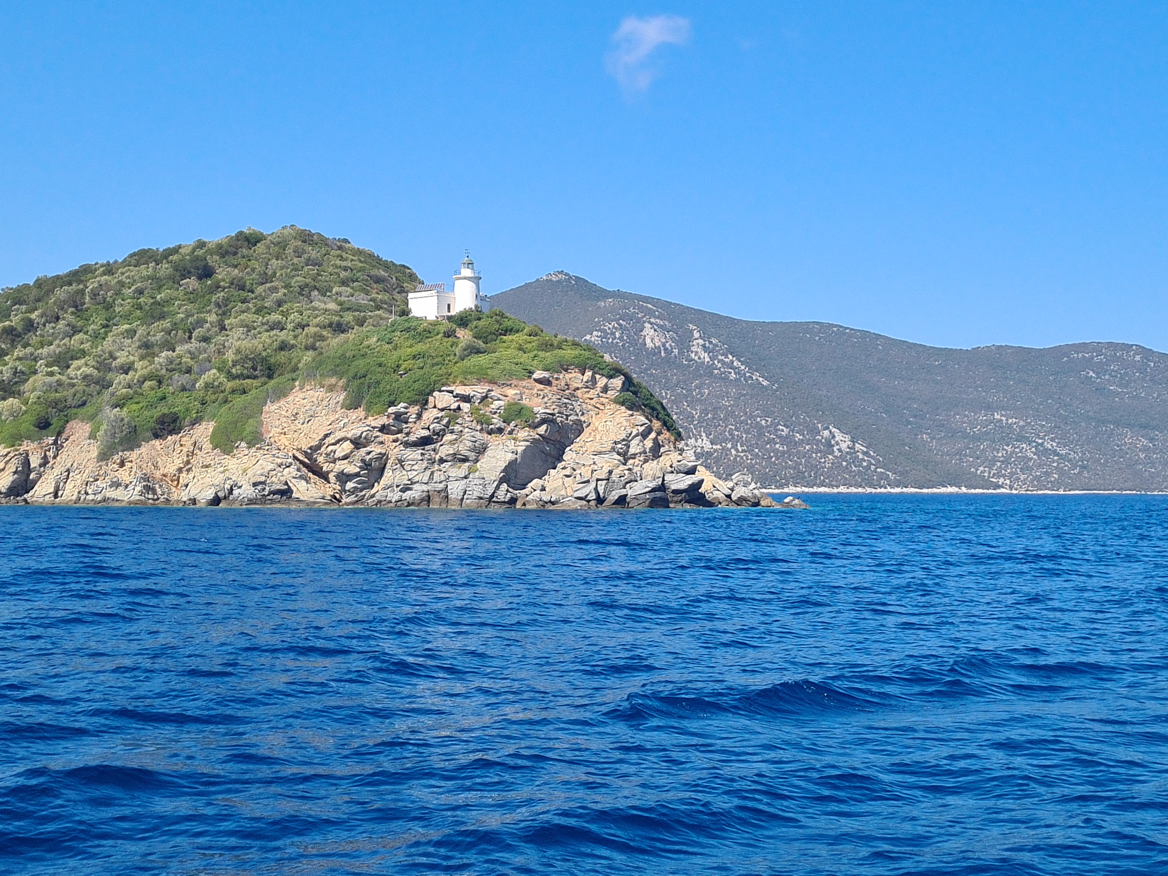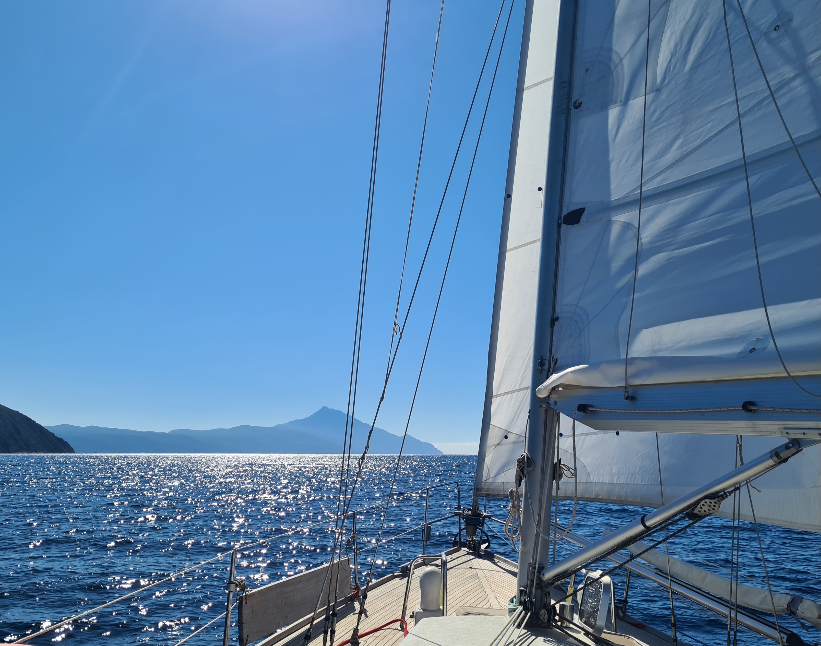 Bijna een maand zeilen we, en ankeren we vooral, rond het middelste schiereiland, Sithonia. Onder invloed van de Meltemi hebben we altijd voldoende wind (en gelukkig zelden te veel) om de warmste zomermaanden goed door te komen. We vinden overal beschutte baaien met kraakhelder water en weinig andere zeilboten. Als het tijd is om de voorraden aan te vullen ankeren we voor een stadje, aan het strand en varen met de bijboot heen en weer met boodschappen en waterzakken om de tank bij te vullen. Zwemmen is heerlijk, het water is minder warm dan in het westelijk Middellandse zeegebied, en tegen zonsondergang is zelfs het maken van een wandeling een prettige bezigheid. Vaak eindigt deze in een Griekse Taverna, al dan niet in goed gezelschap van bevriende medezeilers, waar we ons tegoed doen aan salades, tzatziki, souvlakies, vis, moussaka en andere heerlijke gerechten.