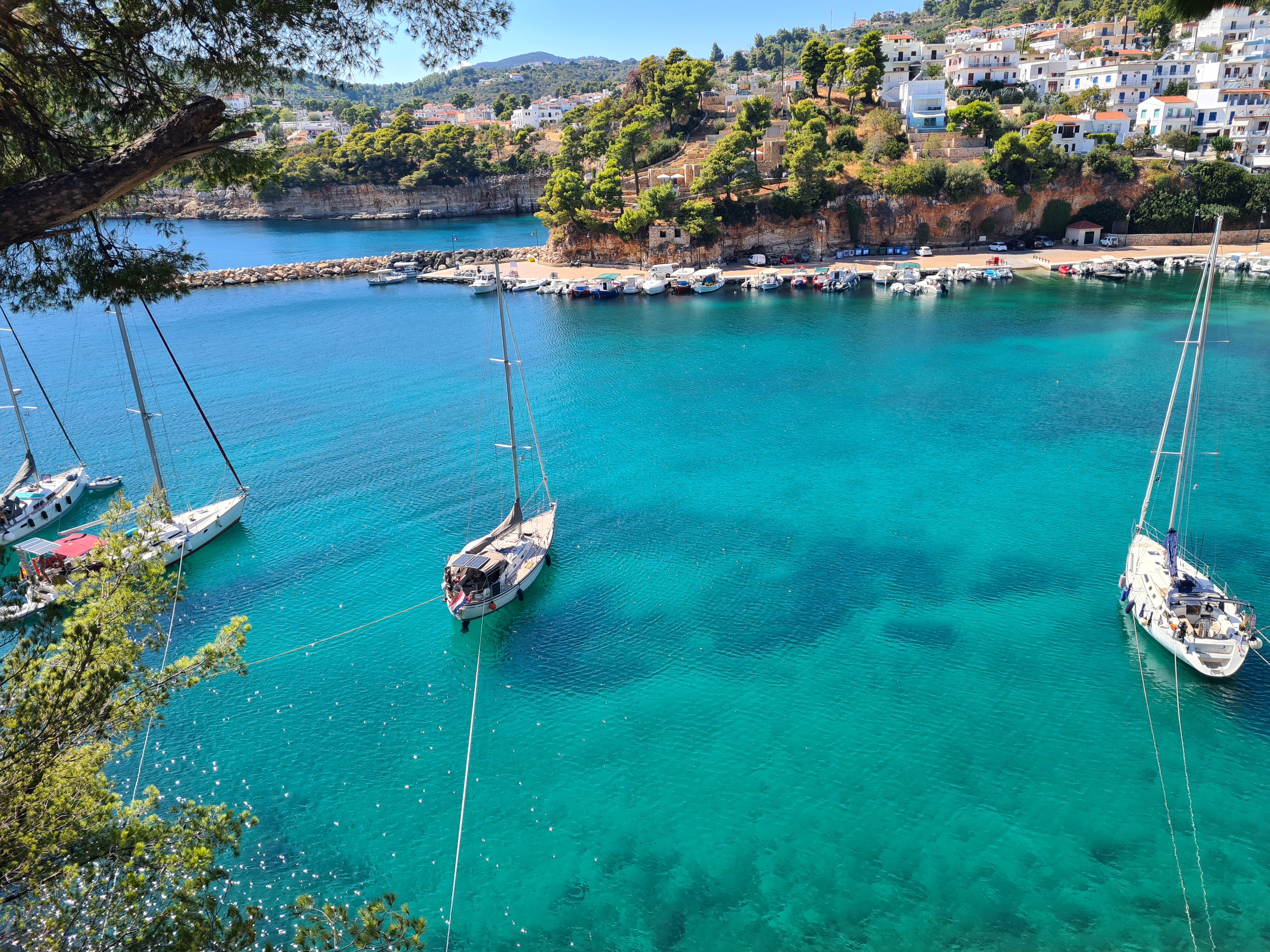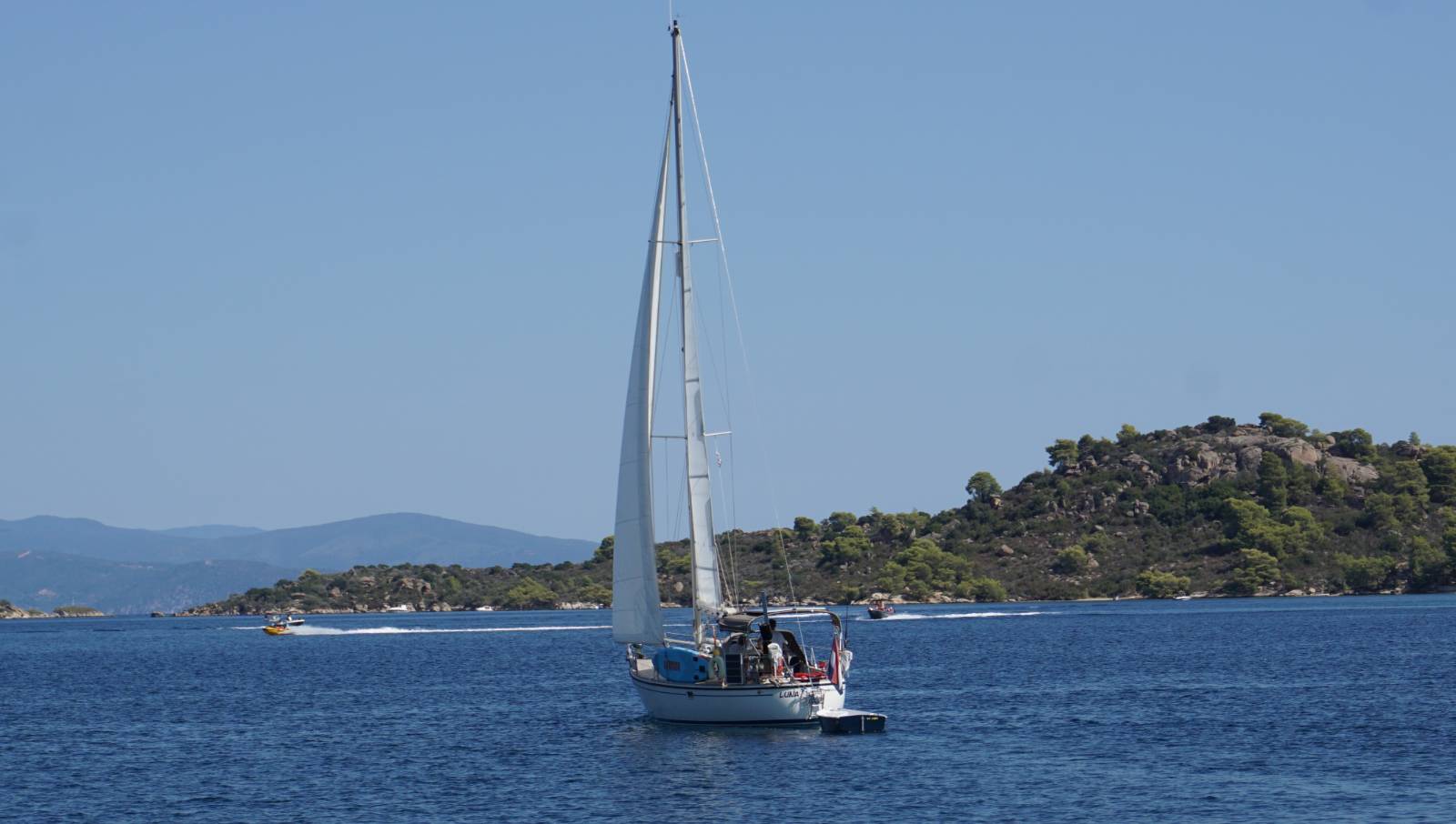 Soms zijn de ankerplekken bij de stadjes druk; de speedboten die aan toeristen verhuurd worden scheuren af en aan, vooral aan de oostkant van Sithonia, in het gebied bij Vourvourou. Dit gebied wordt ook wel de Cariben van Griekenland genoemd. Het is er erg mooi en ook zeer beschut voor wind en golven, maar we zijn blij als we na een dag of tien het anker laten zakken in een baai zonder speedboten. Zeilvrienden Udo en Melanie van de Jera vragen zich af of er behalve anti-muggen spray ook anti-speedbotenspray bestaat… Omdat we die niet vinden stelt Udo dynamiet voor, gelukkig blijft het bij een lumineus idee!